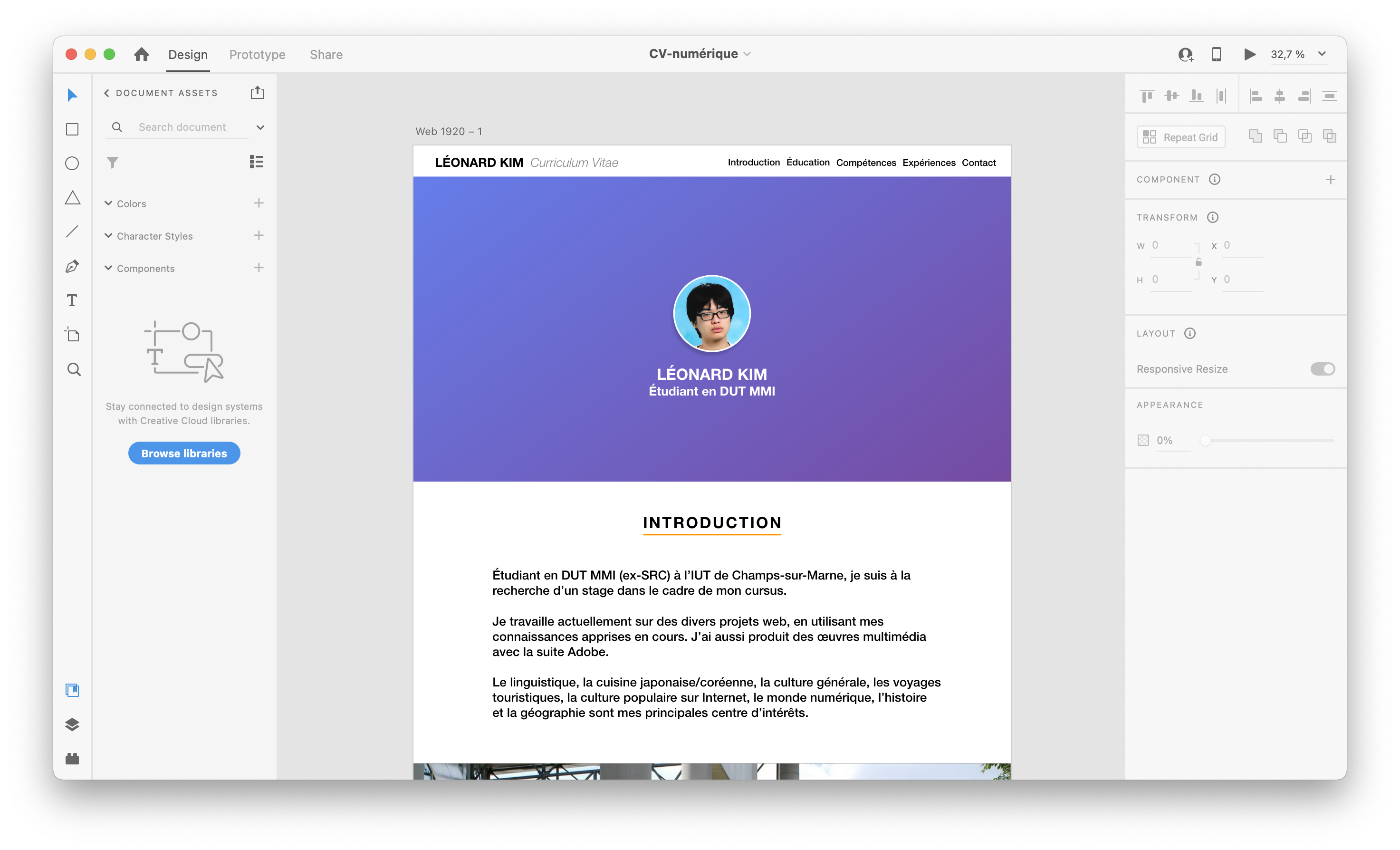 Des prototypes de site web faits sous Adobe XD et Illustrator, en prenant en compte les exigences en termes de design “responsive”. En dessous, un travail en groupe de la refonte du site web de la ville de St-Maur, ainsi que le CV numérique.